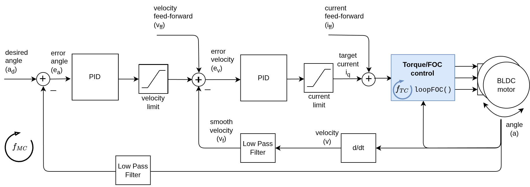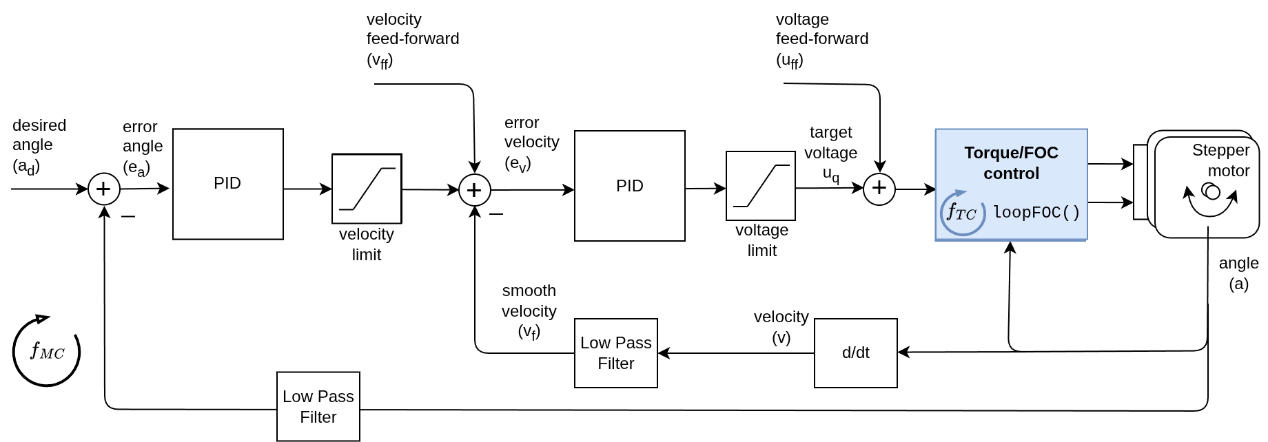 In other words, the velocity control loop will run at a frequency of \(f_{MC} = \frac{f_{TC}}{\texttt{motion_downsampling}}\), meaning that the motor.move() function will be called every motion_downsampling number of motor.loopFOC() calls.