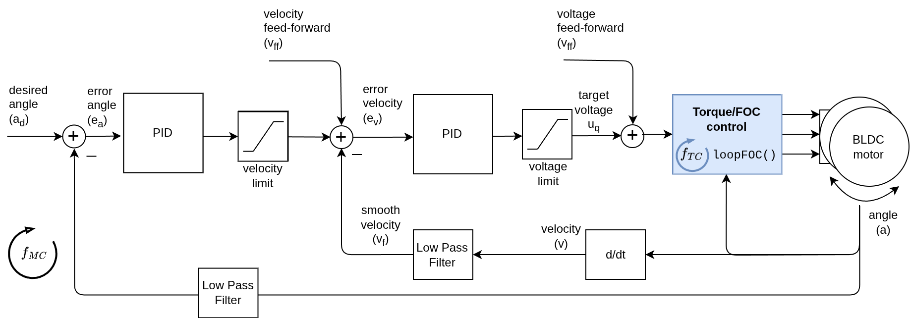 The angle/position control closes the control loop around the velocity control loop. And the velocity control closes the control loop around the torque control, regardless which one it is. If it is the voltage mode, the velocity motion control will set the the torque command using the voltage \(u_q\):