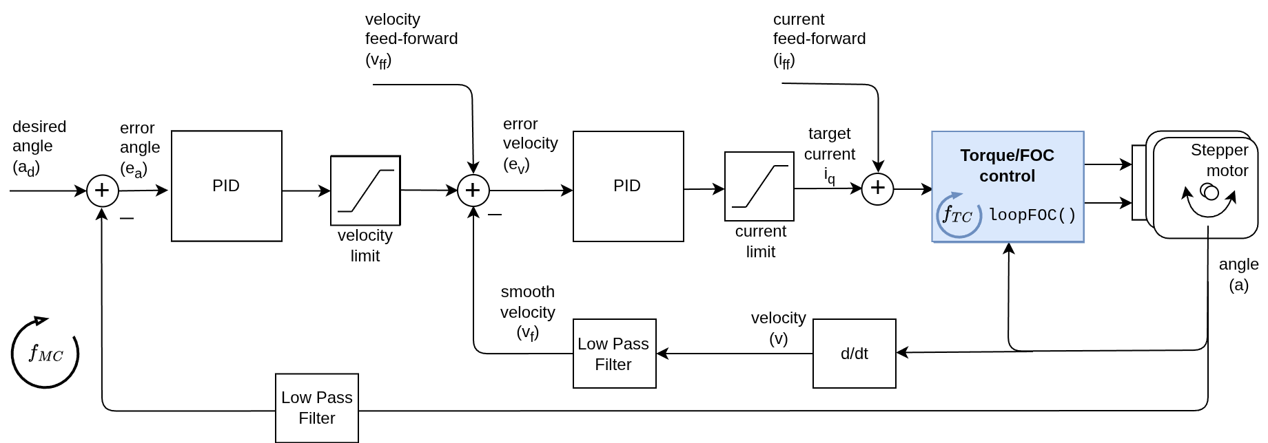 One of the main benefits of this cascaded control is that it allows you to set and modify in real-time the limits on the velocity and torque of the motor.
