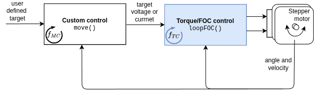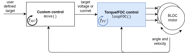 The SimpleFOClibrary also gives you the possibility to implement your own custom control loop. This is an experimental feature and we are not yet 100% happy with the implementation, but we wanted to give you the possibility to try it out and give us feedback. The custom control mode allows you to implement any control loop you want, and link it to the library. This way you can use the library’s functions for reading sensors, controlling the motor and so on, while implementing your own control strategy.