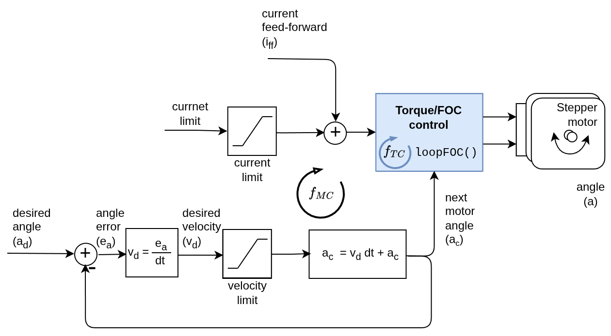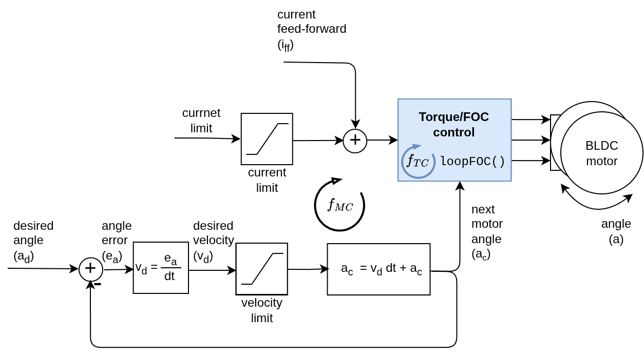 Motion control is the outer control loop in the SimpleFOClibrary, executed within move(). It converts user commands (position, velocity, or torque targets) into a current setpoint (current_sp) that is passed to the torque control layer in loopFOC().