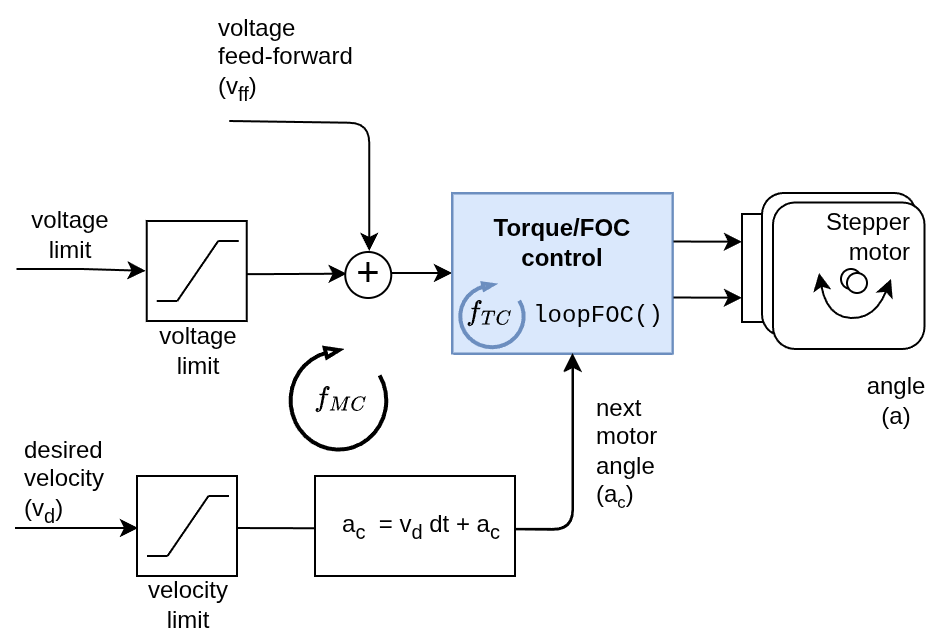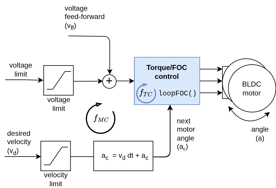 This control algorithm is very simple. User can set the target velocity it wants the motor to turn with \(v_d\). In each step of algorithm execution it is going to add a small angle step to the current angle \(a_c\) in order to achieve the target velocity. The angle step is going to be calculated by multiplying the target velocity with the sample time \(dt\) of the algorithm. Then the maximal allowed voltage motor.voltage_limit or current motor.current_limit is going to be applied to the motor using the underlying torque/FOC control loop (motor.loopFOC()).