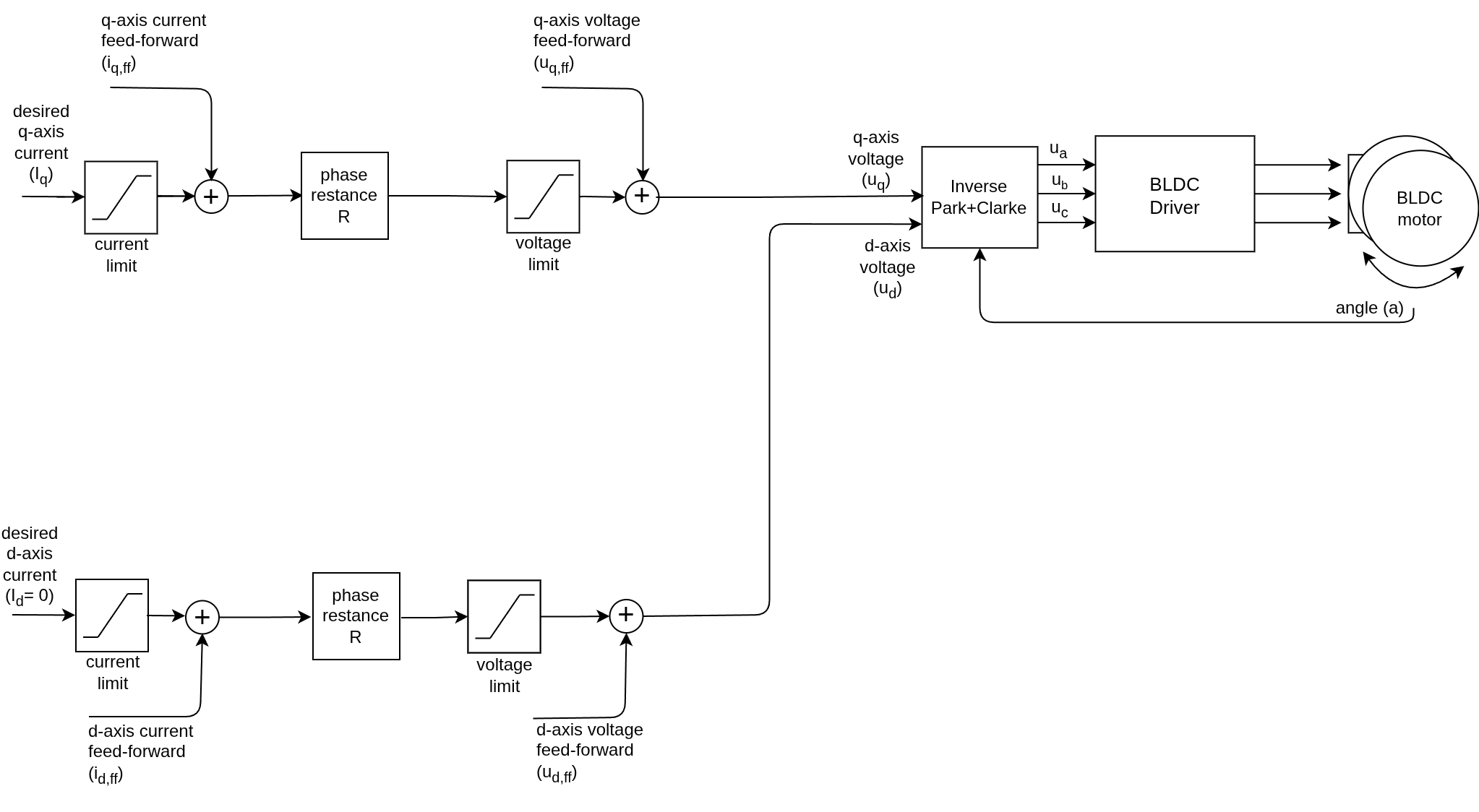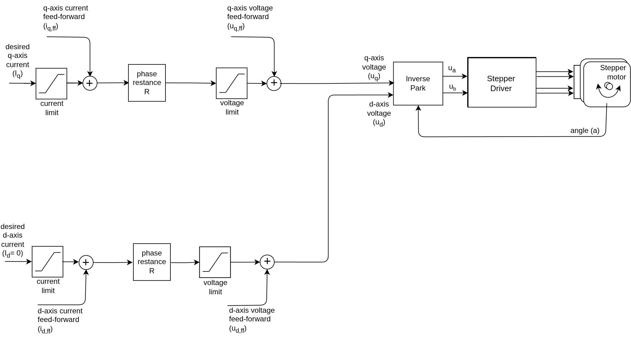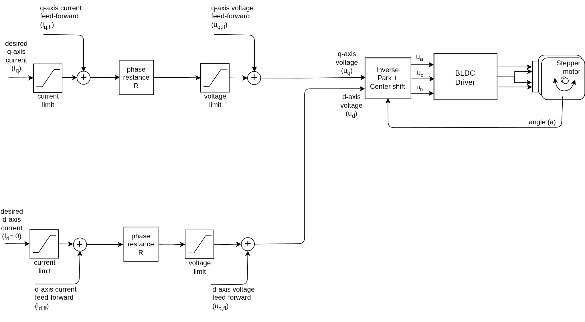 If the motor phase resistance \(R\) is known, we can compensate for the voltage drop across the resistance to maintain a constant current. Then instead of applying a fixed voltage \(u_q\), we apply the current \(i_q\) multiplied by the resistance: In steady state with \(v = 0\):